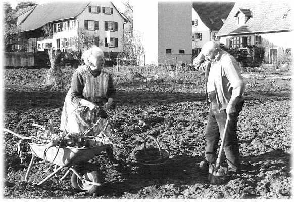 letzten Jahrzehnten mehr und mehr in den Hintergrung gerückt. Garten bedeutet eben Arbeit. Und Gemüsegarten noch viel mehr. So kommt es, das um viele Häuser herum heute nur noch das Bau- und Gartenmarkt-Standardprogramm zu finden ist. Möglichst pflegeleicht, möglichst robust. Daß Gartenbau Mühe bedeutet, zeigen die beiden folgenden Bilder. Kurt und Marie Wölfle bei der Arbeit im Briel. |